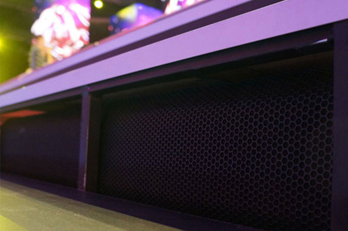 春晚的舞台宽约30米,其台唇部分全部设计成台阶,以方便演员上下,台阶上横向摆放了4只VIDA系统用以覆盖舞台正前方的嘉宾观众区,由于VIDA系统的宽度只有21CM(与踏步台阶高度一致),所以完全可以轻松的安装于此,同时还能提供完美的音质和足够的声压级。VIDA L的心脏是一个有着超级运算能力的FPGA现场可编程门阵列芯片,由于VIDA可以进行纵向的波束控制,所以横置安装的VIDA可以在水平方向控制扬声器波束的开口角度和覆盖范围,覆盖精准到0.1°,这样就可以为前区观众提供更加精准的音频覆盖。
