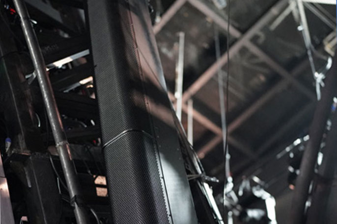除了上述观众席覆盖的难点之外,本次春晚音频系统的另外的一个难点就是如何解决众多演员的舞台返听问题。由于整个舞台面积非常宽阔,而且组成舞台地面和上空全是随时需要升降活动的LED屏,所以整个舞台的地面完全没有安装摆放返听音箱的位置,同时作为背景的舞台后部大屏及侧面大屏也对舞台上的声音产生了非常严重的反射干扰,所以为了保证给舞台上的演员提供完美的返听音响效果,VIDA系统也被用于舞台的返听系统。VIDA系列是一款内置48路独立DSP和功放通道的特殊扬声器,可以轻松通过APP软件的实时控制实现声波束的调整,垂直+/- 45°间自由可调节,能够精准的控制扬声器的声场覆盖并且避开会产生反射干扰的各种场地结构。晚会现场,音频制作团队在舞台两侧各吊挂安装了各4组VIDA L+C系统组成两组线性阵列。