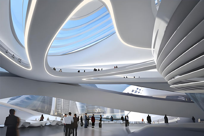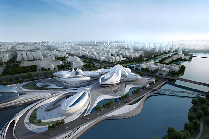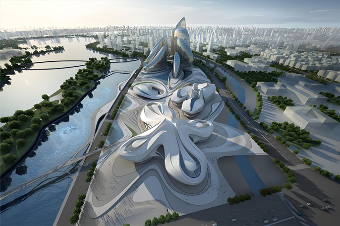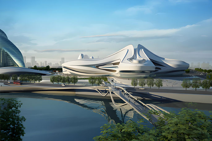 伊拉克裔英籍建筑设计师扎哈.哈迪德(Zaha Hadid)有着女建筑界魔头之称。这位曾获普利兹克建筑奖的女建筑师在近十年来在各大地标性建筑的竞赛中几乎无人能敌。梅溪湖文化艺术中心位于湖南省长沙湘江新区,总投资约28亿元人民币,包括一座1800座的大剧院、一座500座的小剧场和一座由9个展厅组成的艺术馆。建筑的外观酷似长沙市花芙蓉,其寓意是从岳麓山上飘下来三朵形态各异的芙蓉花。她的定位为湖南省规模最大、功能最全、全国领先、国际一流的国际文化艺术中心。