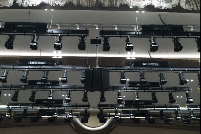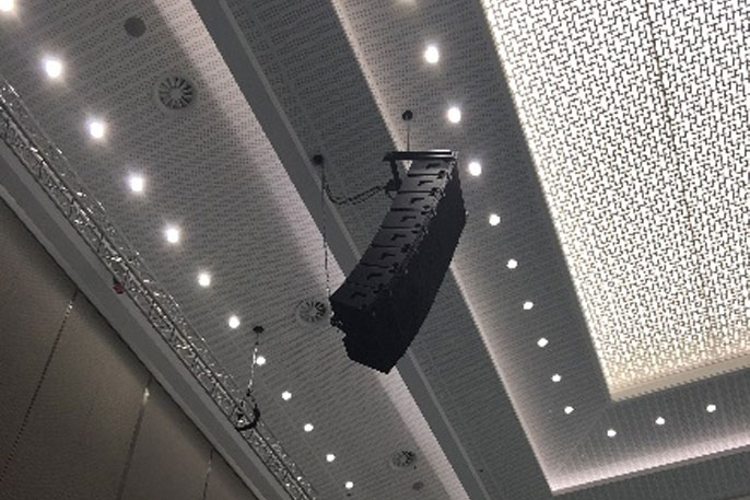 位于三层的宴会大厅面积为3300㎡是峰会的宴会场地,大厅高度为10米,为了使会场达到最好的声音效果采用了吊挂的方式安装了LINE 212-SP有源系列扬声器,该系列独特的Click & Fly®'吊挂系统可以非常便捷的进行垂直或者水平吊挂安装。大厅顶部暗藏安装了36只经典的CA 1215系列扬声器,这样无论是正常使用大厅还是将大厅分割变化为2个独立会议厅都可以得到非常均匀的声场覆盖。这个大厅同样也准备了一套由LINE 212-SP+SW 118E-SP组成的有源流动系统以应对不同的会议和活动需求。另外一套由LINE 212-SP+CA1215组成的系统应用于午宴厅中。