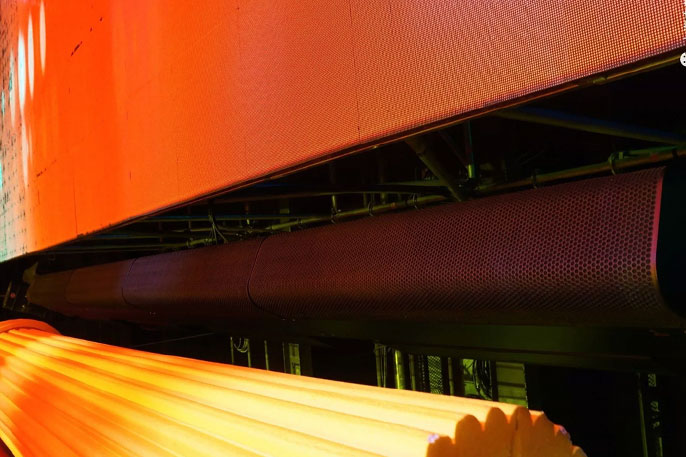从上图可以看出现场大屏幕和布景之间留下的空隙不足40厘米,如果采用传统的线阵列扬声器根本无法安装,可是VIDA扬声器的宽度只有21厘米所以吊挂其间却非常轻松,甚至还有充分的余地进行水平角度的调整。16只VIDA扬声器分为4组(每组4只)吊挂安装于4组大屏幕的衔接处,从现场以及最终的画面呈现上看这些扬声器完全是“隐形”的。对舞美和视觉效果没有一丝一毫的影响。