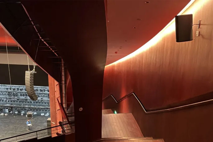 NOMOS XLS超低频扬声器作为配套使用。舞台两侧采用了GRAVIS系列点声源扬声器作为固定安装的返听扬声器,顶部返声板内部也采用GRAVIS系列作为效果声系统。观众席周围的环绕声系统和台唇补声系统则采用了SONA系列扬声器。